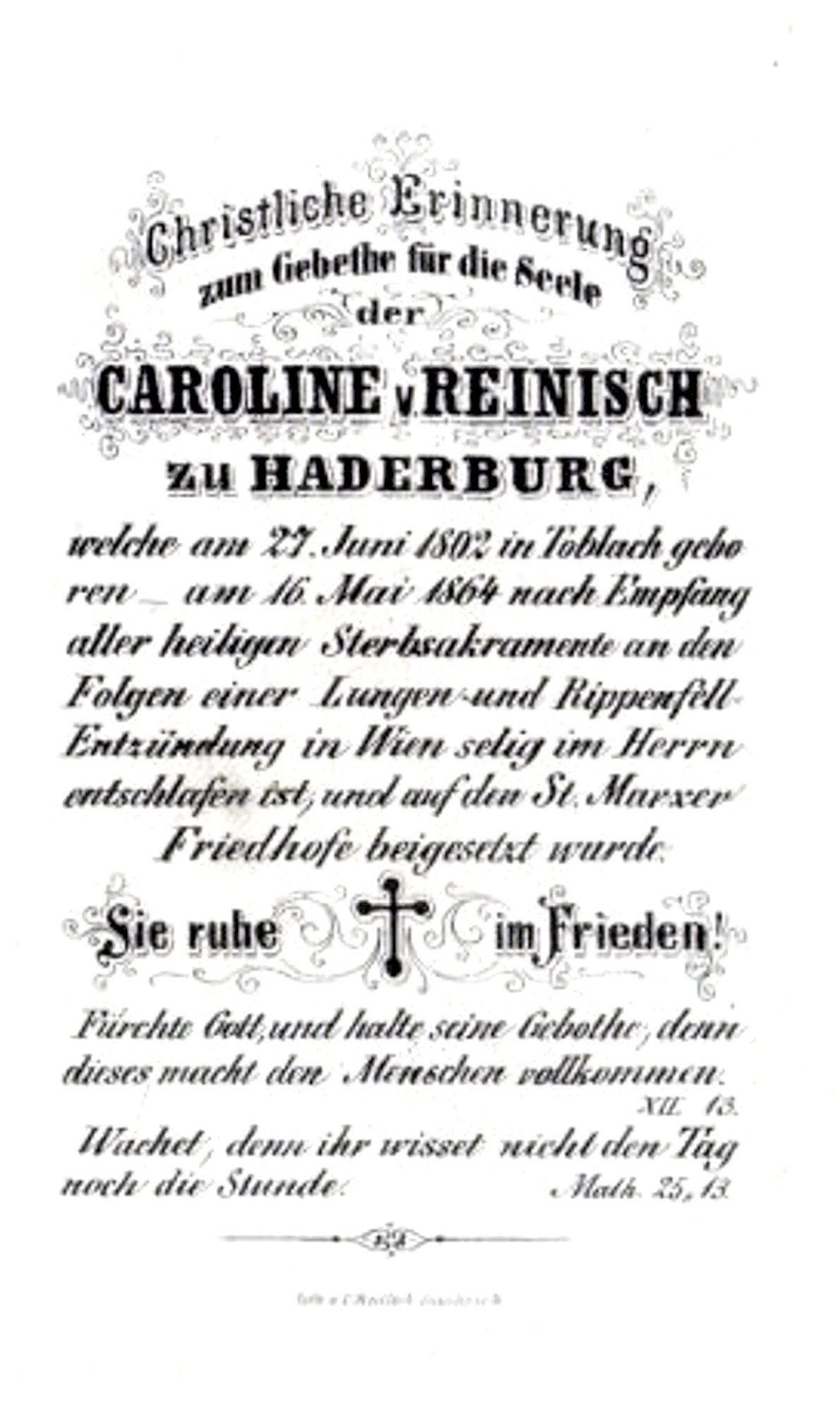 Andenken-/Sterbebild Reinisch zu Haderburg Caroline von / + 1864