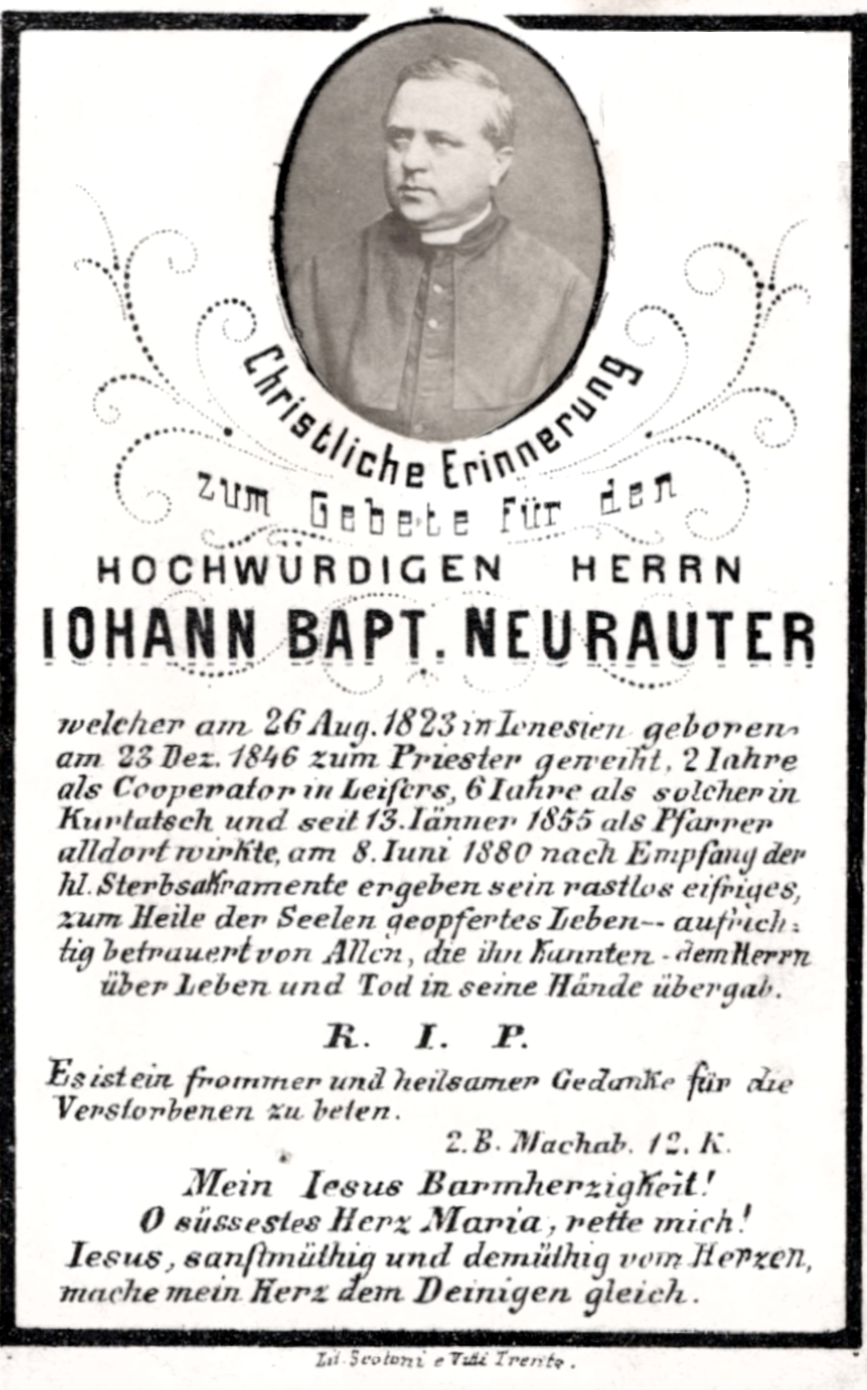 Andenken-/Sterbebild Neurauter Johann Baptist / Pfarrer von Kurtatsch / + 1880 Jenesien-Kurtatsch
